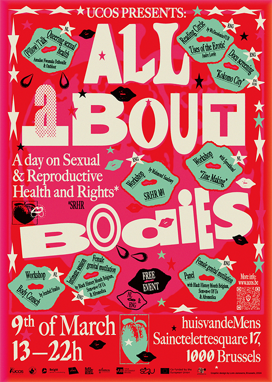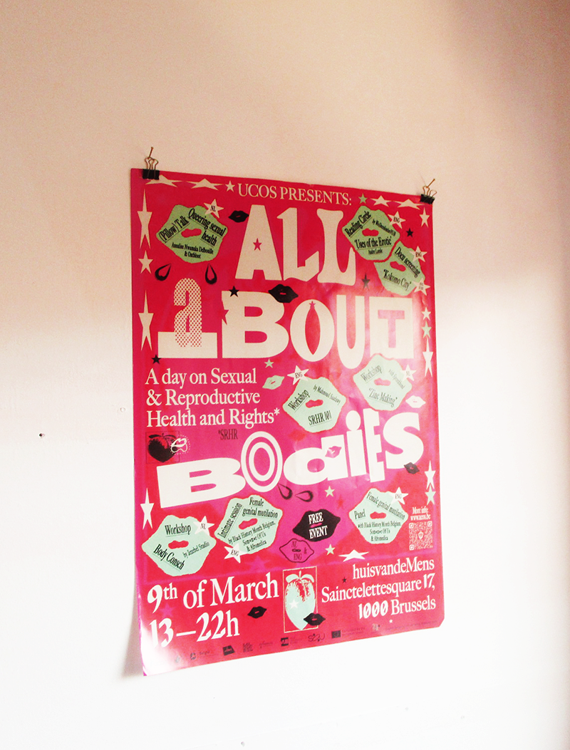 ↑ Identity and poster design for UCOS Brussels' event 'All About Bodies', an afternoon on Sexual and Reproductive Health and Rights. (2024)