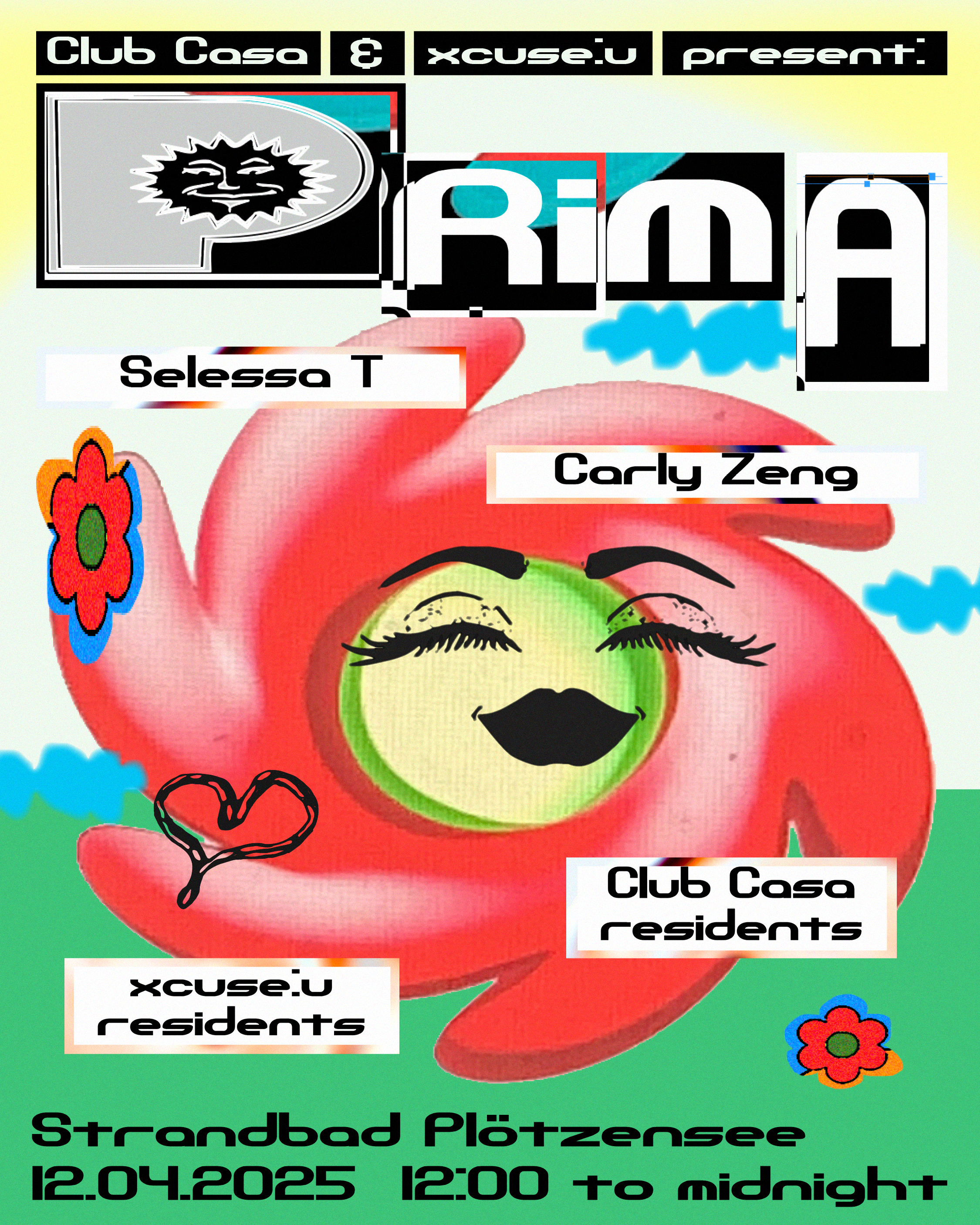 ↑ Poster design for daytime spring party 'PRIMA', organized by Club Casa and xcuse:u at Plötzensee Berlin. (2025)